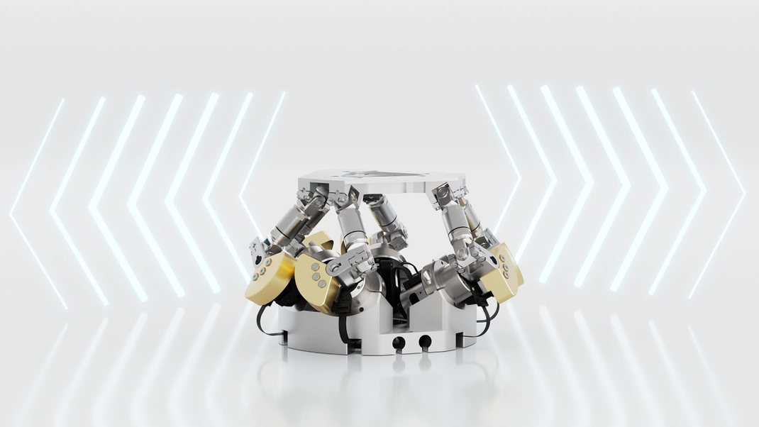 Our innovative lever hexapod combines robust ball bearings with direct power transmission, eliminating the need for a screw drive, for example. The result is a compact system that offers exceptional durability and maximum dynamics. High-precision displacement of the base point of each hexapod strut along a circular path enables targeted, micrometer-precise changes to the pose of the cover plate within a millimeter workspace. Compared to classic hexapod systems, where leg length is adjusted via a screw drive, lever kinematics enable significantly faster movements with a flatter design.