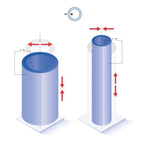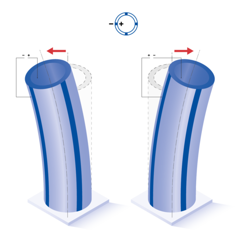 Polarization directionDepending on the contacting and attachment of the electrodes, different bending occur in the axial, radial and lateral directions. For more information see >> Operating Modes.