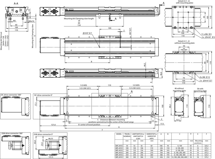 | Travel range [mm] | 50 | 100 | 150 | 200 | |||||