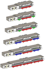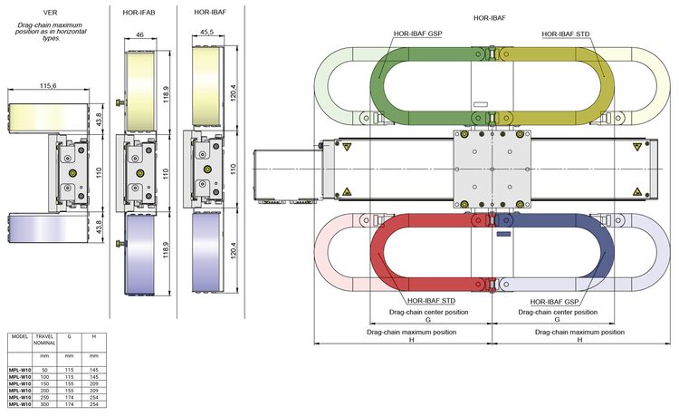 The drag chain can be attached to the stage in eight different positions. These include four vertical and four horizontal positions. Within the horizontal positions, the following additional variants are available: HOR-IFAB whereby the inner part of the drag chain is fixed and outer part moves, and HOR-IBAF whereby the inner part moves and the outer part is fixed. The drag chain is an accessory and can be attached by the customer. The drag chain can either be attached to the side slots or to the clamping claws.