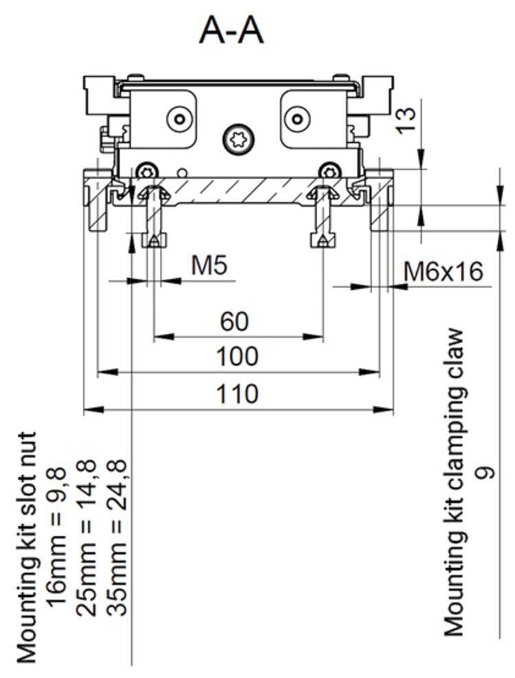 The slot nut mounting kit can be used for all configuration variants of the stage. It serves to mount the axis in the application environment. The slot nuts are inserted into the slot located on the bottom of the stage and screwed to the surface through a through-hole. The kits include various screw lengths.