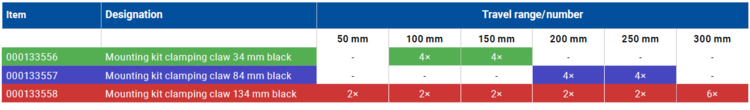The clamping claw mounting kit can be used for all configuration variants of the stage. It serves to mount the axis in the application environment. The clamping claws are inserted into the lateral slot and attached to the surface with screws. The screws are included with the clamping claws in various lengths.