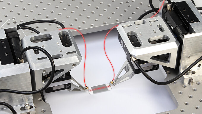 The machine is based on TEGEMA's modular platform architecture, which allows the connection of hardware modules specific to the application at hand. For testing and packaging of PICs, the machine vision systems for rough positioning, an adhesive dispenser, a UV light source for curing the adhesive, and a rotation platform are used to transport the individual elements and, consequently, the finished components. At the heart of the photonic assembly platform are ultrafast and high-precision active alignment systems from PI. Our motion and positioning mechanics and firmware routines enable ultrafast alignment of the optical elements in the submicron range. The tracking mode compensates for position changes of the optical elements induced by stresses during adhesive curing. This special mode is part of the gradient search algorithm. Depending on the requirements of the specific application, different versions of PI alignment solutions are used, such as a double-sided alignment system.