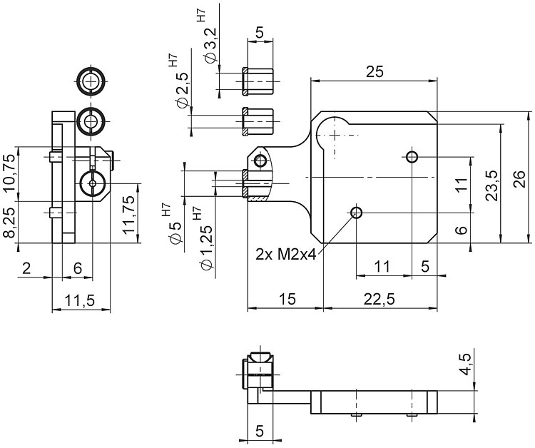 Fiber holder 90° for P-616, with fiber optic ferrules 1.25 mm, 2.5 mm, and 3.2 mm
