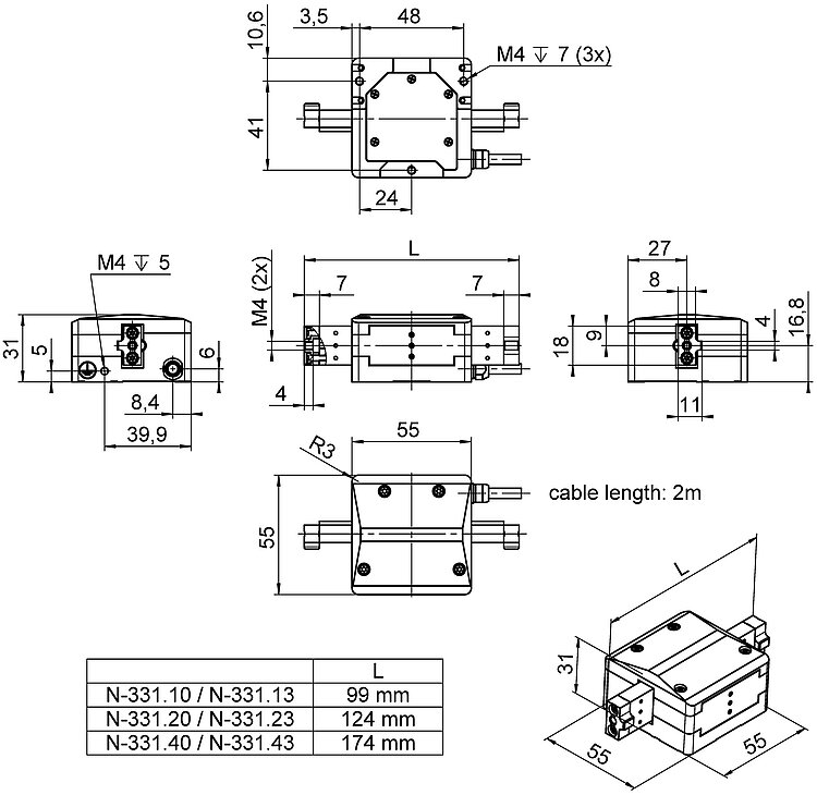 | Travel range in X, open loop | 30 mm | 30 mm | 55 mm | 55 mm | 105 mm | 105 mm | ±0,5 mm |