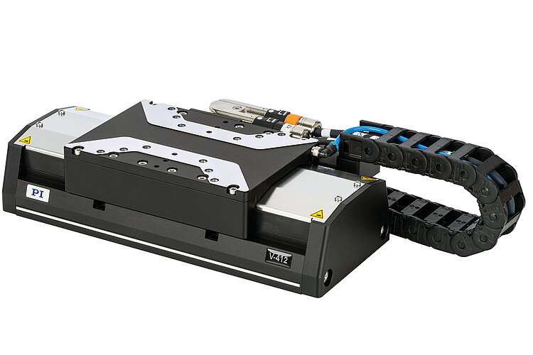 With the V-412, PI has a high-precision linear stage with linear motor in its portfolio for industrial solutions. Its design is consistently geared to demanding industrial conditions and it is characterized by high stiffness and the use of high-quality components: High-performance ironless linear motors, heavy-duty recirculating ball bearing guides, and precision incremental linear encoders. The high resolution of the encoders allows an excellent tracking performance, small tracking errors, and short settling times. For maximum flexibility, it is possible to choose between incremental and absolute encoders. Absolute encoders supply explicit position information that enables immediate determination of the position. This means that referencing is not required during switch-on, which increases efficiency and safety during operation. Industry-compatible connectors offer a fast and secure connectivity. The covering strip on the side and the purge air connector prevent contamination by particles.