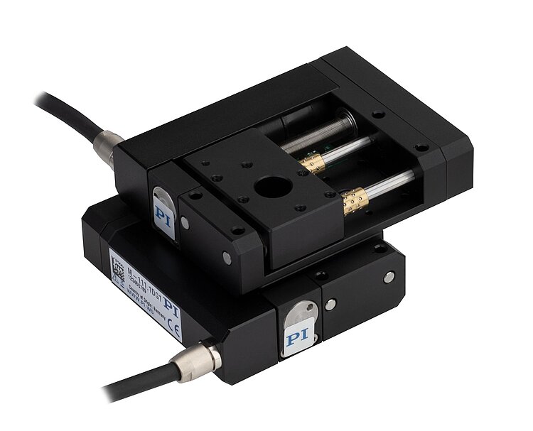 Linear stage with compact size due to folded drive with belt drive. Clear aperture with 10 mm Ø. XY setups can be mounted directly without adapter plate.