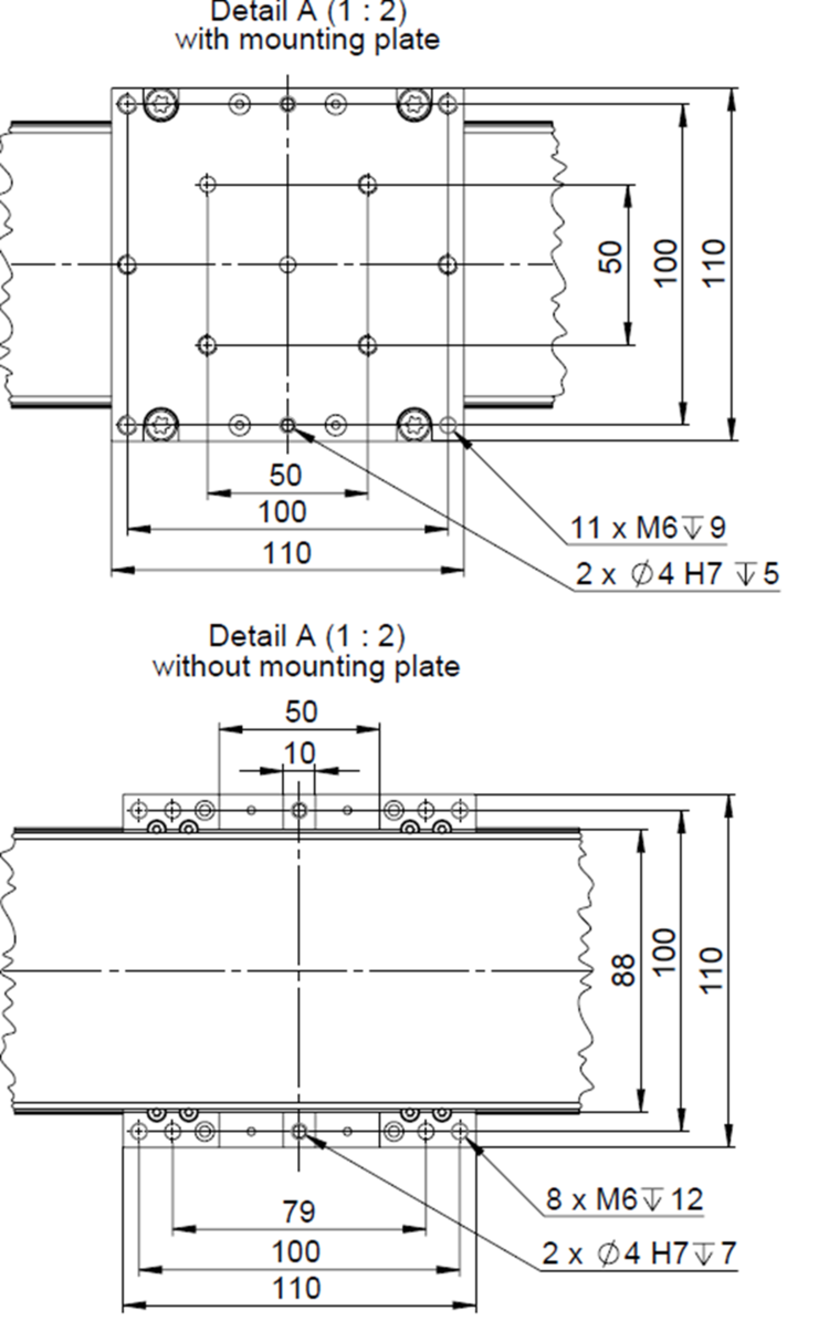 | Maximum velocity in X, v unloaded [mm/s] | 50 | 100 | 250 | 20 | 40 | 100 | |||