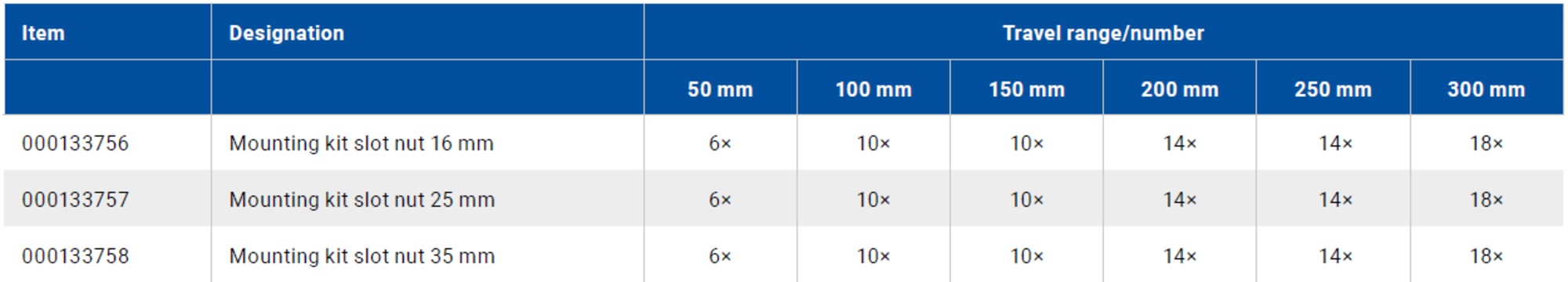 The slot nut mounting kit can be used for all configuration variants of the stage. It serves to mount the axis in the application environment. The slot nuts are inserted into the slot located on the bottom of the stage and screwed to the surface through a through-hole. The kits include various screw lengths.