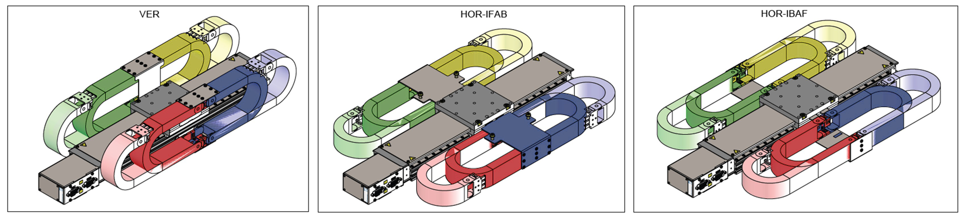 The drag chain can be attached to the stage in eight different positions. These include four vertical and four horizontal positions. Within the horizontal positions, the following additional variants are available: HOR-IFAB whereby the inner part of the drag chain is fixed and outer part moves, and HOR-IBAF whereby the inner part moves and the outer part is fixed. The drag chain is an accessory and can be attached by the customer. The drag chain can either be attached to the side slots or to the clamping claws.