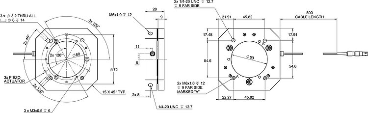 Note on electrical capacitance: 1,5 µF per piezo actuator. Small-signal capacitance measured at 1 Vpp, 1 kHz, room temperature, tolerance ±20 %