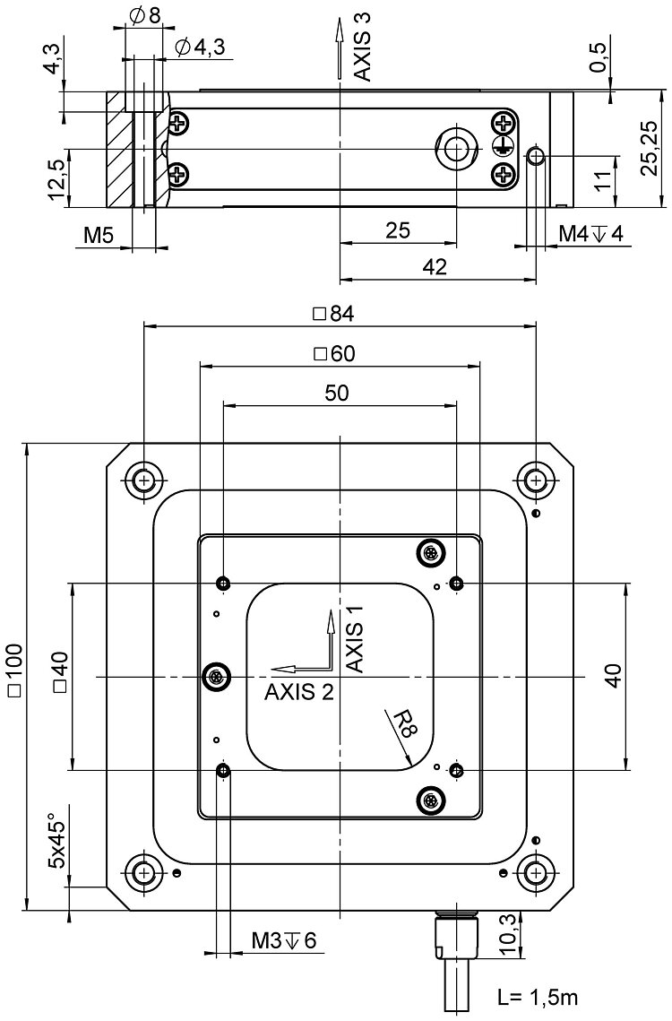 XYZ piezo nanopositioner; 100 µm × 100 µm × 10 µm travel range (X × Y × Z); capacitive, indirect position measuring; D-sub 25W3 (m); 1.5 m cable length