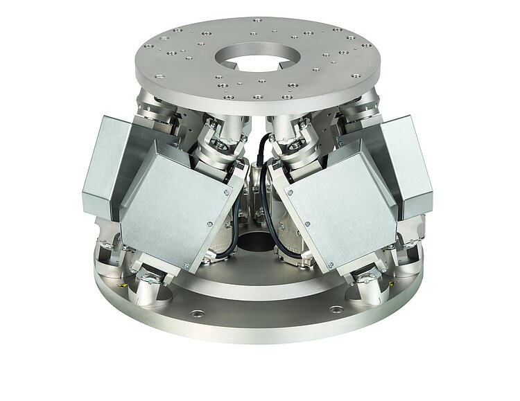 Parallel-kinematic design for 6 degrees of freedom, making it significantly more compact and stiff than serial-kinematic systems, higher dynamics, no moved cables: higher reliability, reduced friction. Compact due to folded drive design.