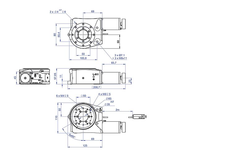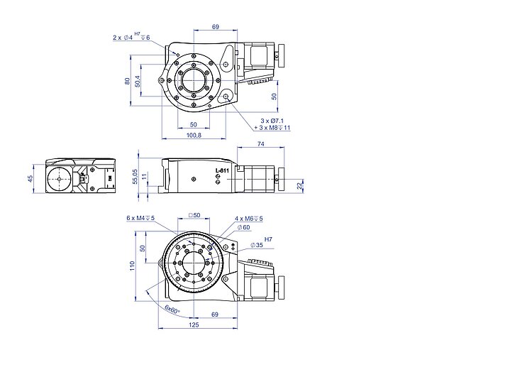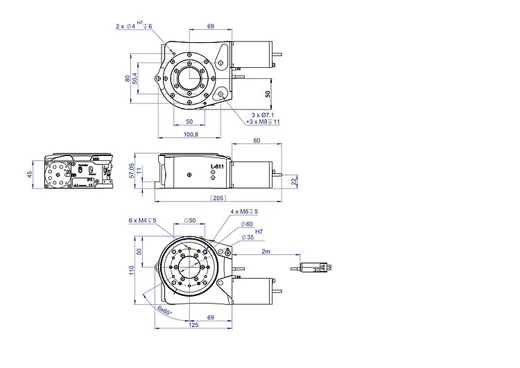 High-precision positioning due to low-play preloaded worm gear. Preloaded pivot bearings for high run-out accuracy. Clear aperture with 35 mm Ø. Unlimited travel range in both directions of rotation. Reference switch.