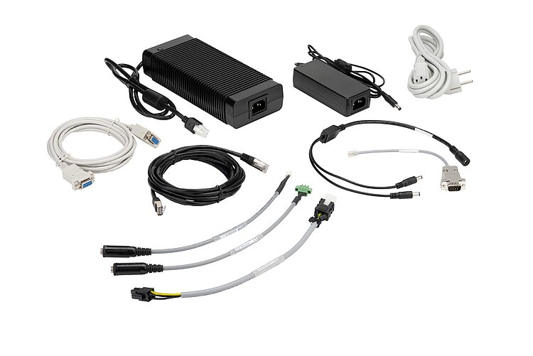 Accessories kit for ACS components ECMsm, IDMsm, UDMsm: power adapters and adapter cables for power supply with 24 or 48 V DC, Safe Torque Off (STO) adapter, interface cables and adapters